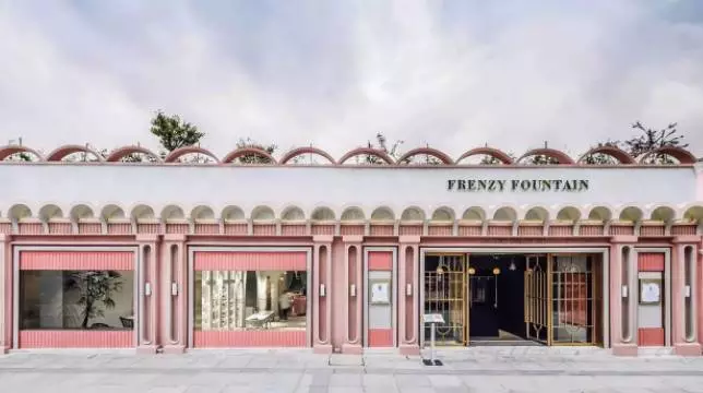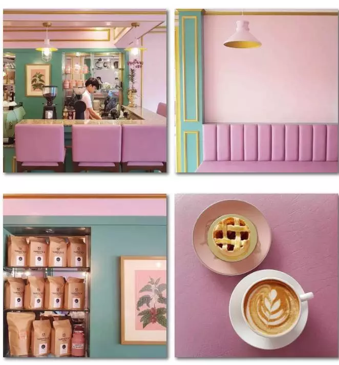 不同于上面那家咖啡馆的绿色系,这里整体运用的是淡雅的粉红色,营造少女梦幻般的场景。地面与空间顶部相互呼应的不规则图形设计,视觉呈现很独特。其中还融合了tiffany蓝主题和森系的空间,透露出细腻的轻奢感。