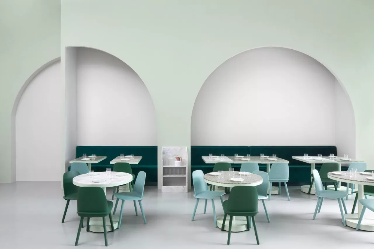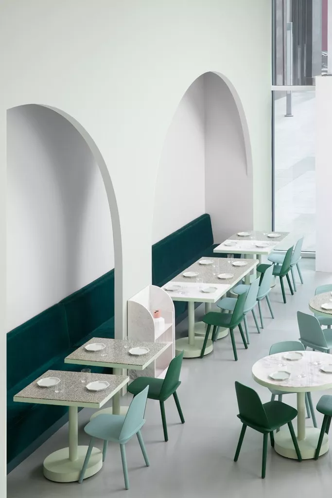 店内又多处拱门形状的设计,这是为了模仿韦斯·安德森设计中强迫症一般的对称性。用拱门创造出隐藏的作为区域和搁架单元,空间层次幻化生动,也展现出一种文艺复古的风格气质。